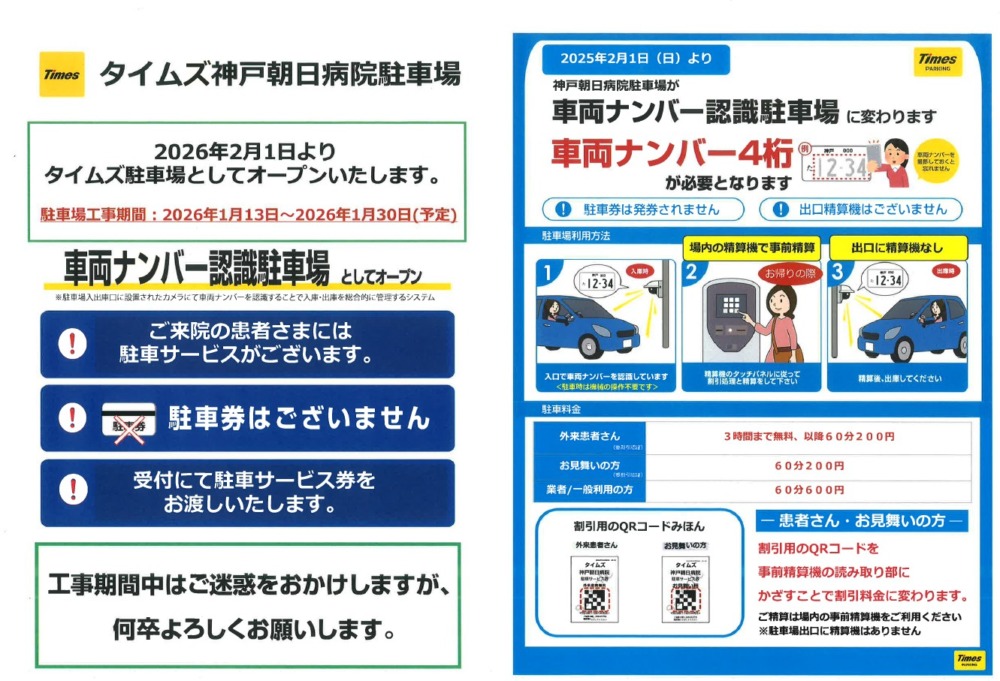 当院、第一及び第二駐車場は、2026年2月1日(日)より「タイムズ神戸朝日病院駐車場」としてリニューアルオープンいたします。